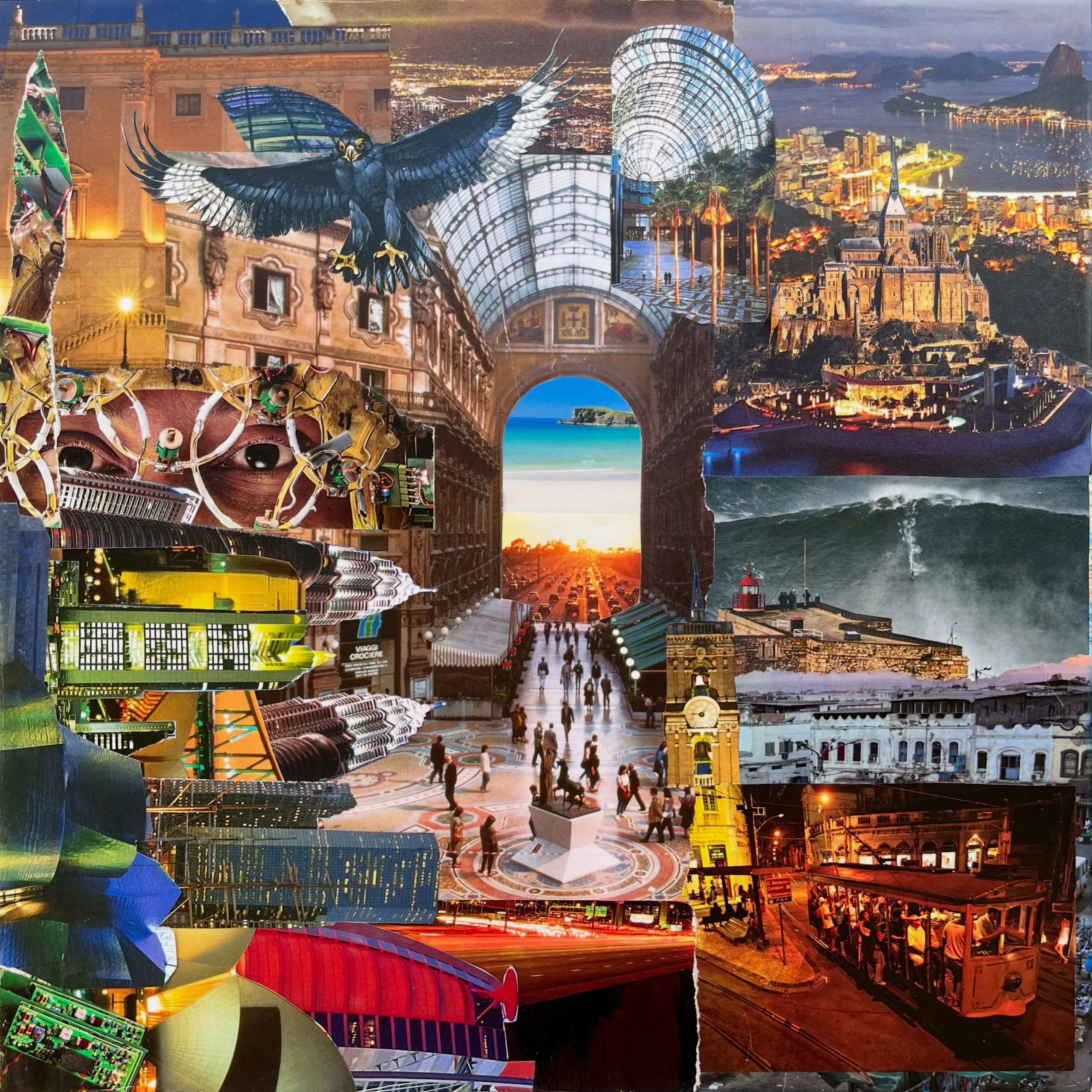 Tech Noir is a series of three futuristic jazz albums by Thomas Molina and Colin James Gordon. I was honored to be commissioned for the album art. Each collage is 16 ×16 inch. The canvases are wrapped in vintage magazines and maps. Each album is a vivid sci-fi fantasy- starting with a murder and ending on a distant planet. Listen to Tech Noir Volume I-III streaming now on spotify.